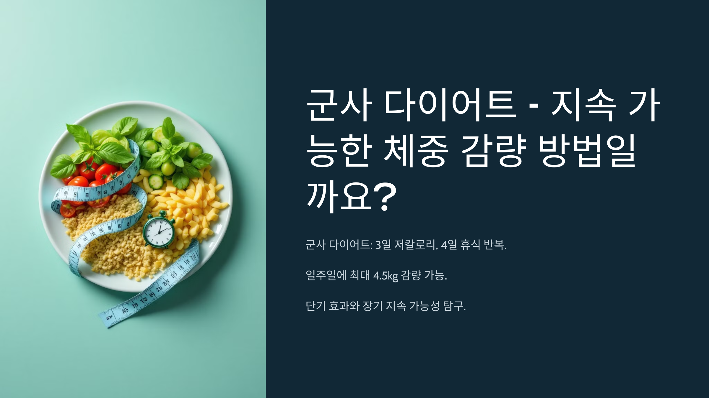 다이어트 방법이 넘쳐나는 현대 사회에서 '군사 다이어트'는 그 독특한 이름과 단기간의 효과로 많은 사람들의 관심을 끌고 있습니다. 군사 다이어트는 3일간의 저칼로리 식단과 4일간의 휴식 주기를 반복하며, 일주일에 최대 4.5kg까지 감량할 수 있다고 홍보됩니다. 하지만 단기 효과가 과연 지속 가능한 장기적인 감량으로 이어질 수 있을까요? 이번 글에서는 군사 다이어트의 구성과 효과, 장단점, 그리고 장기적인 유지 가능성에 대해 자세히 알아보겠습니다.