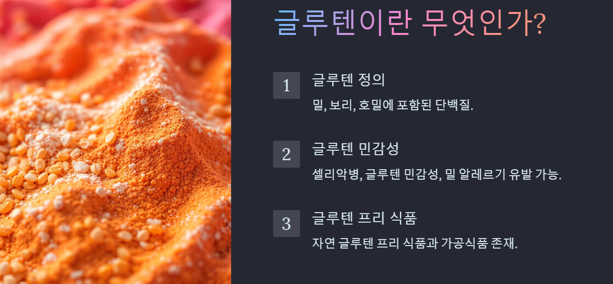 글루텐은 밀, 보리, 호밀 등에 포함된 단백질로, 특히 빵이나 면류에서 쫄깃한 식감을 제공하는 역할을 합니다. 글루텐은 빵을 만들 때 반죽을 부드럽고 탄력 있게 해 주며, 다양한 가공 식품에도 종종 첨가됩니다. 하지만 글루텐은 모든 사람에게 무해한 것은 아니며, 일부 사람에게는 건강에 해로울 수 있습니다.