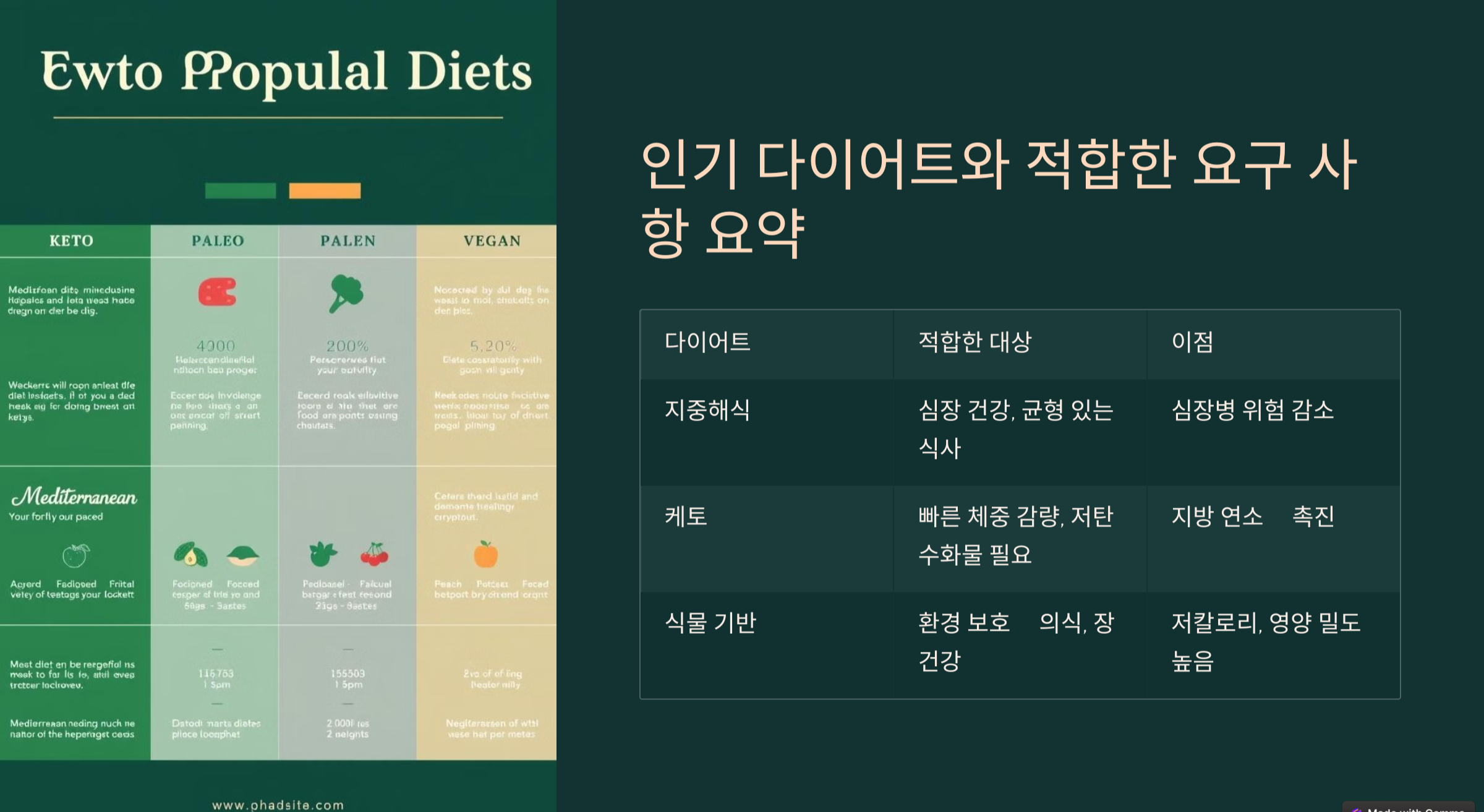 | 식물 기반 | 환경 보호 의식, 장 건강 | 저칼로리, 영양 밀도 높음 |