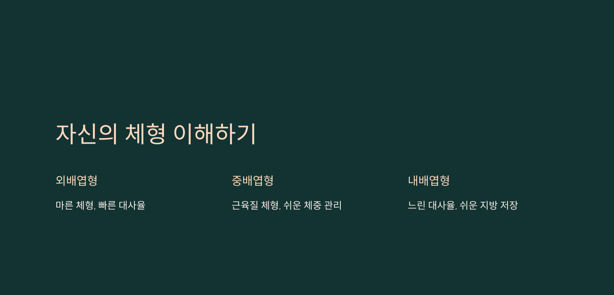 - 외배엽형: 자연스럽게 마른 체형으로 대사율이 빠른 편입니다.