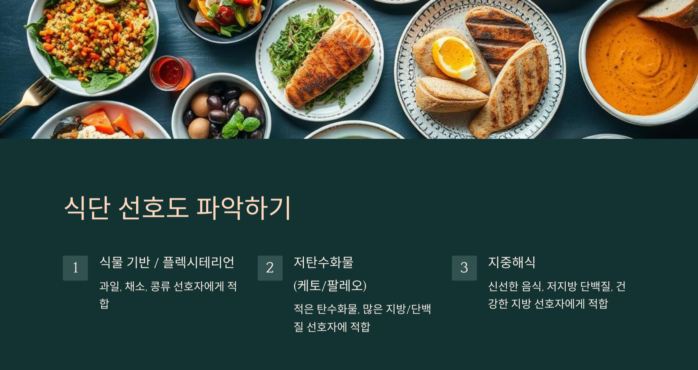 | 지중해식 | 심장 건강, 균형 있는 식사 | 심장병 위험 감소 |