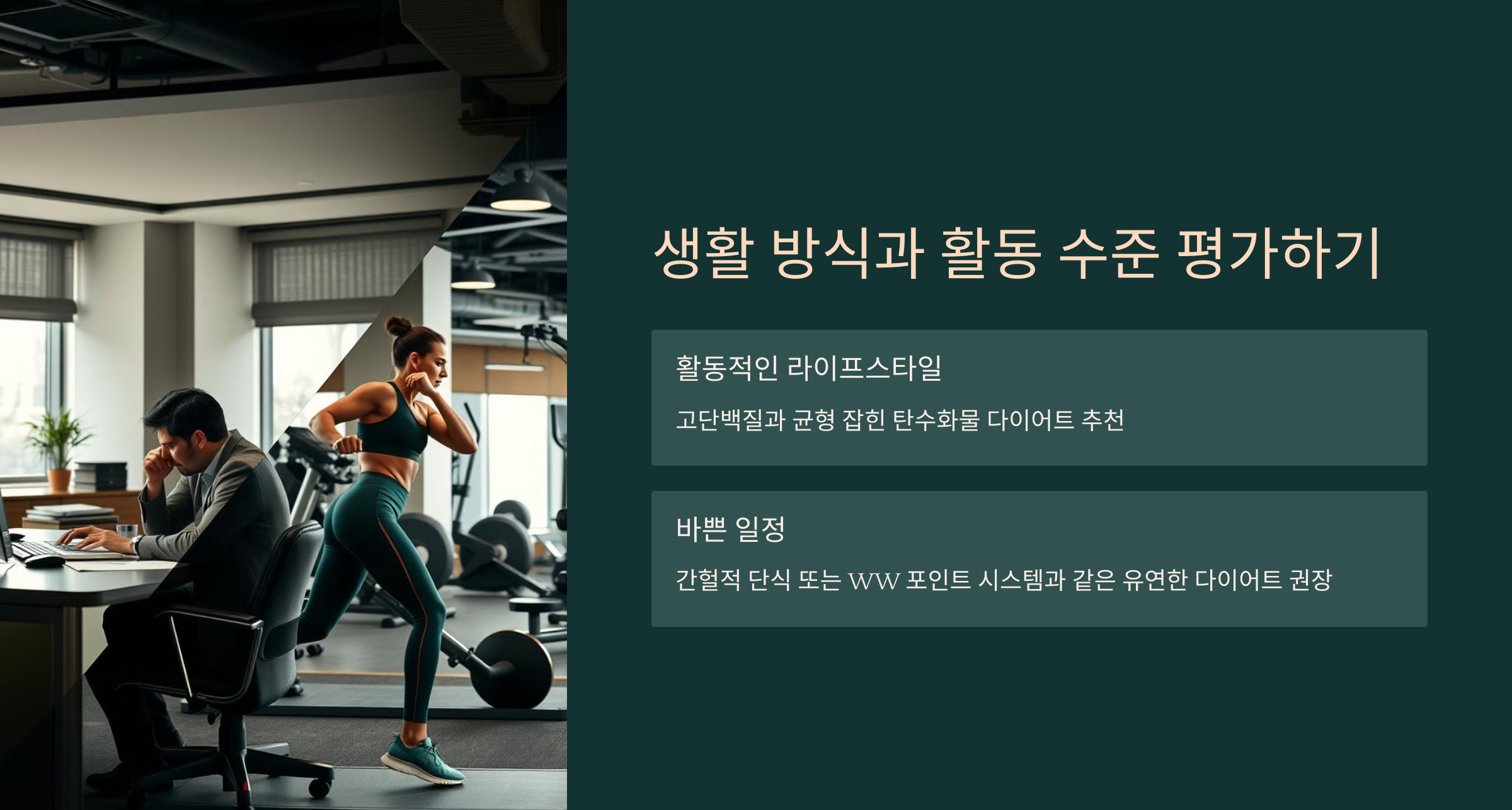 - 바쁜 일정: 간헐적 단식 또는 WW(웨이트 워처스) 포인트 시스템과 같이 유연한 지침을 제공하는 다이어트가 관리하기 쉽습니다.