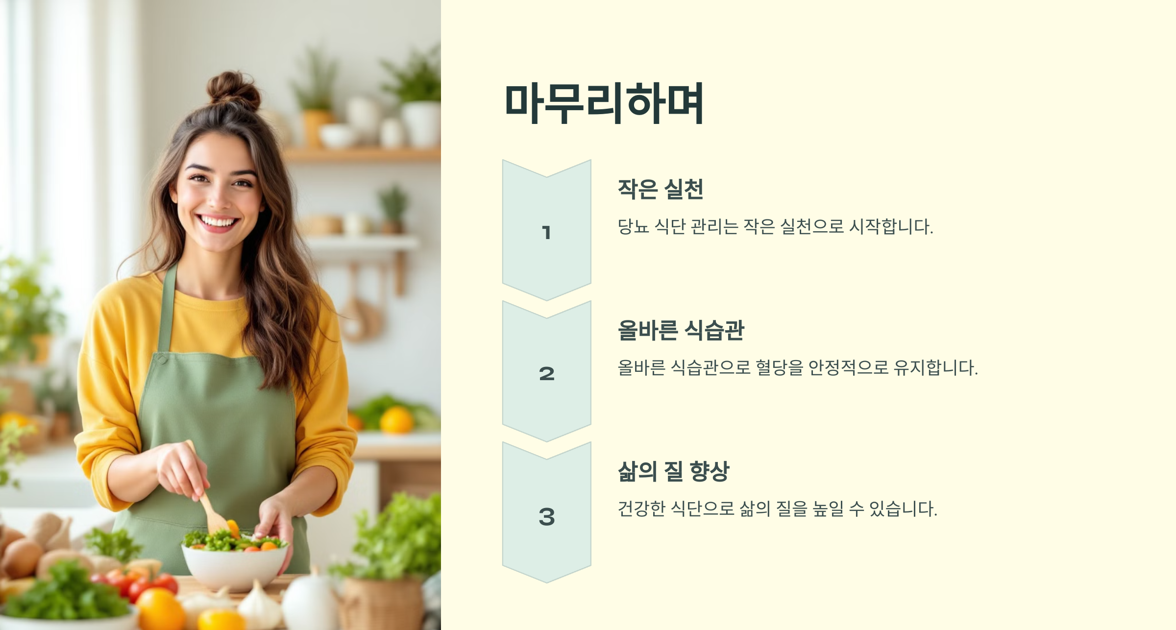 당뇨 식단 관리는 생각보다 복잡할 수 있지만, 작은 실천이 쌓이면 큰 변화를 만듭니다. 오늘부터 당뇨 관리에 도움이 되는 올바른 식습관을 실천해 보세요. 건강한 식단이 당신의 혈당을 안정적으로 유지하고, 삶의 질을 높이는 데 큰 도움이 될 것입니다.😊