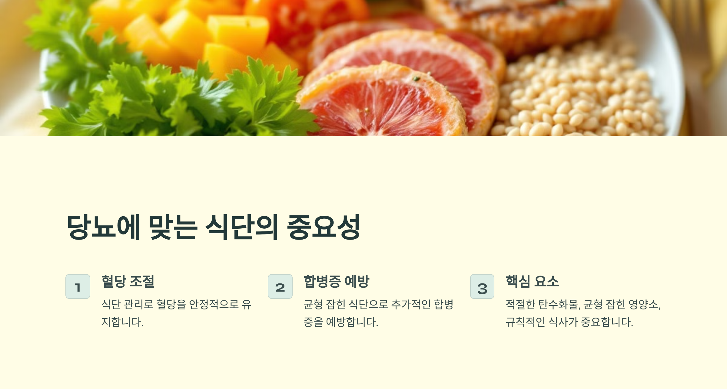 당뇨병은 체내 혈당 조절이 잘 되지 않아 발생하는 만성 질환입니다. 식단 관리는 혈당을 안정적으로 유지하고, 추가적인 합병증을 예방하는 데 중요한 역할을 합니다. 혈당이 급격히 상승하거나 하락하지 않도록 균형 잡힌 식단이 필요합니다.