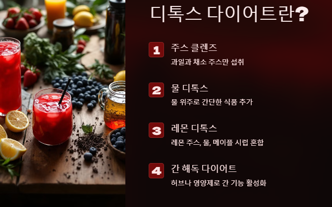 디톡스 다이어트는 주로 과일, 채소 주스, 허브, 물 등을 섭취하여 신체에서 유해 물질을 배출하는 것을 목표로 합니다. 디톡스 다이어트의 종류는 다양하며, 대표적인 방법은 다음과 같습니다: