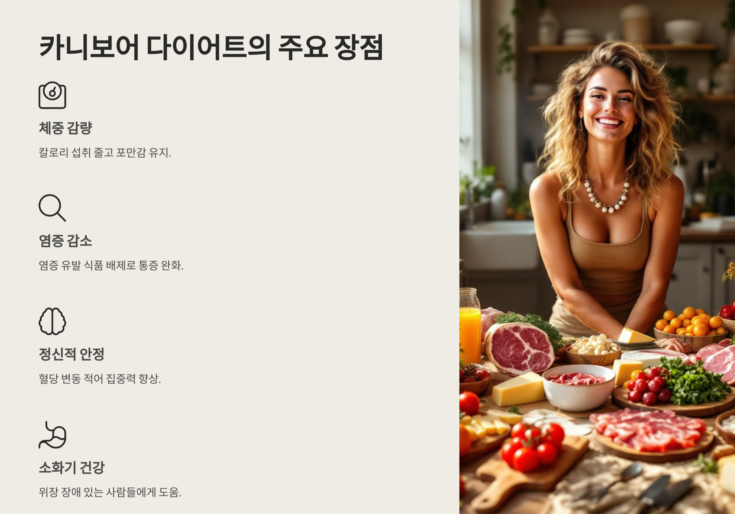카니보어 다이어트는 탄수화물을 제한하고 고단백 고지방 식단을 유지하기 때문에 체중 감량에 도움이 될 수 있습니다. 단, 체질에 따라 다를 수 있으니 개인별 적응 기간이 필요합니다.