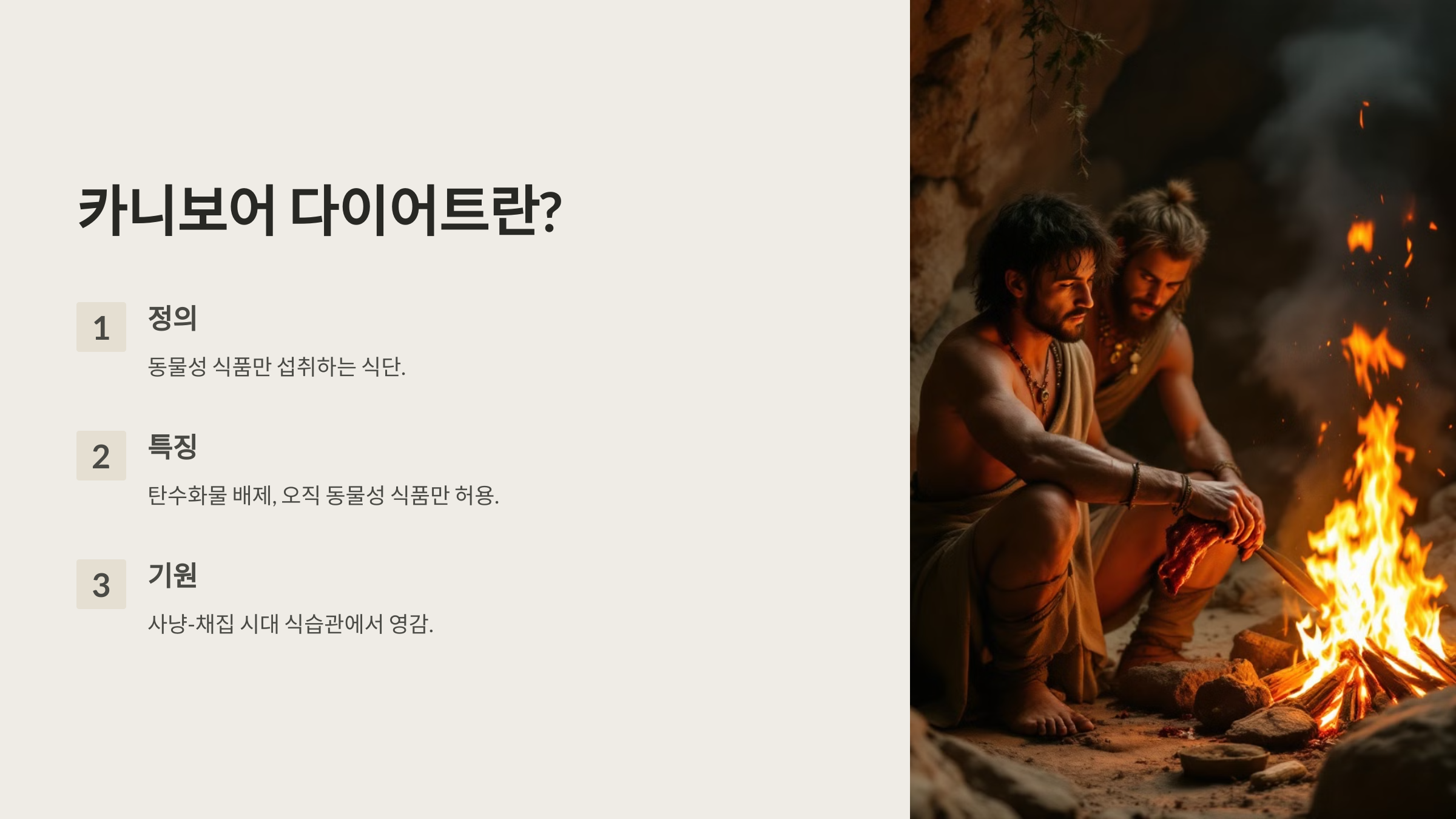 카니보어 다이어트는 사냥-채집 시대의 식습관을 현대화한 개념으로, 초기 인류가 주로 동물성 식품을 섭취했던 방식에서 영감을 받았습니다. 이런 원시적 식단을 현대인의 건강 문제에 적용해 체중 감량, 염증 감소, 소화 건강 개선 등 여러 효과를 주장하는 사람들이 늘고 있습니다.