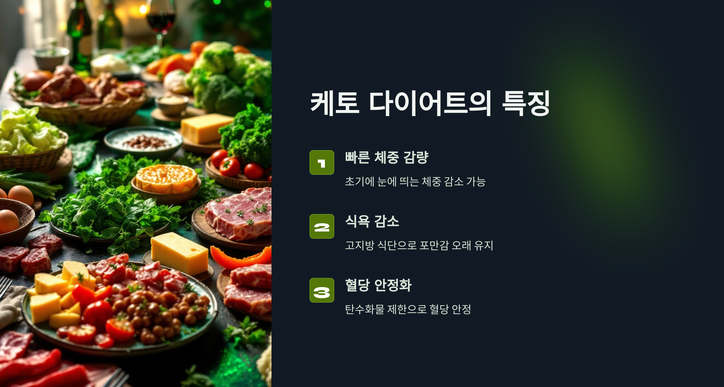- 혈당 안정화: 탄수화물을 제한하므로 혈당이 안정되며, 당뇨 환자에게 긍정적인 영향을 줄 수 있습니다.