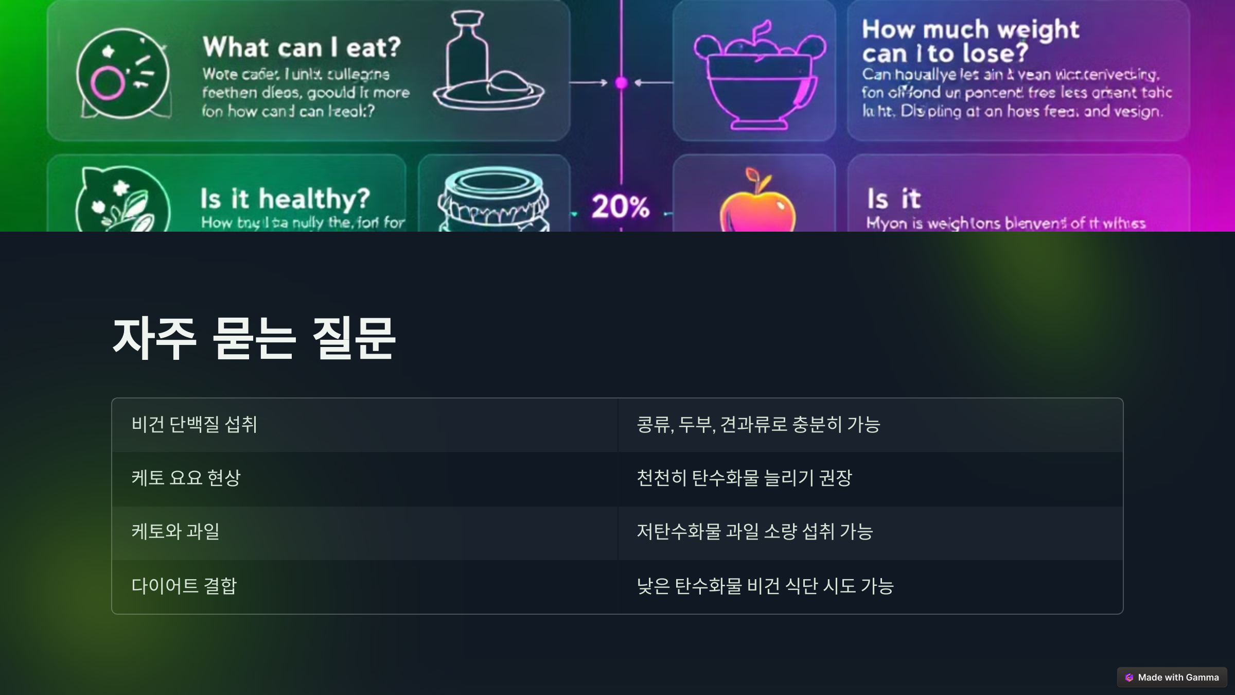 - 가능합니다. 낮은 탄수화물 비건 식단을 통해 비건과 케토의 장점을 동시에 활용할 수 있습니다.