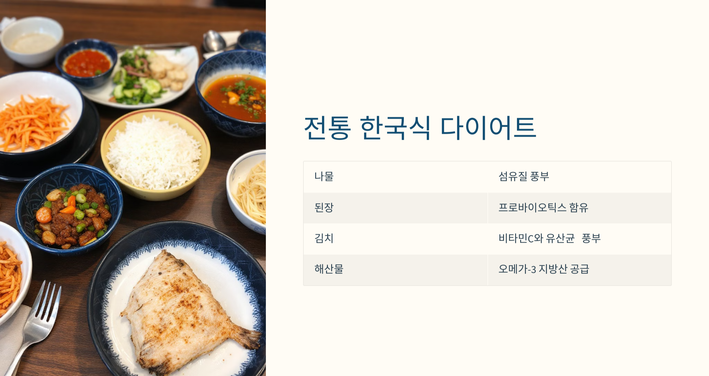 - 특징: 나물, 된장, 김치 등 발효식품과 해산물 중심의 식단