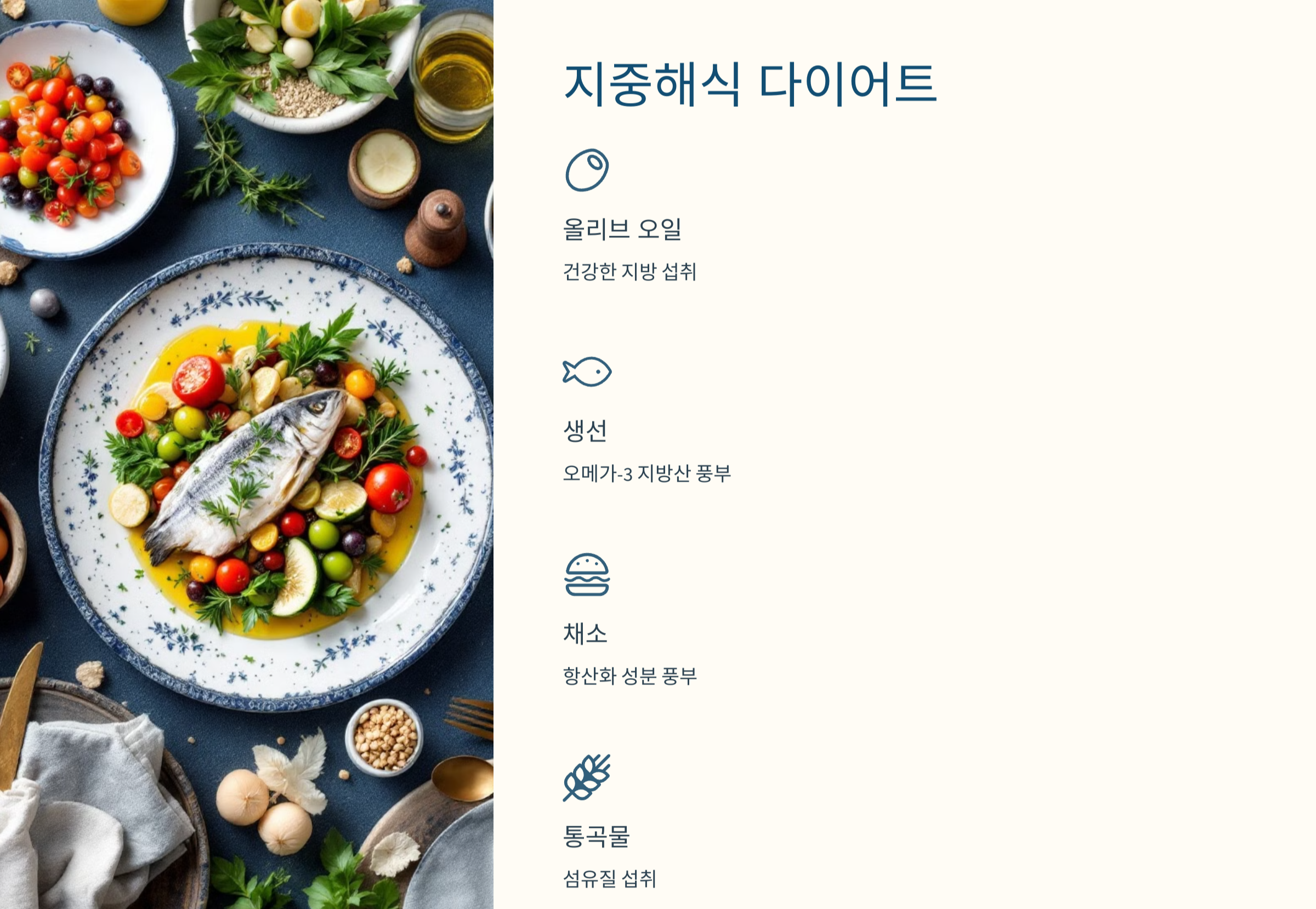 - 특징: 올리브 오일, 생선, 채소, 통곡물 섭취 중심