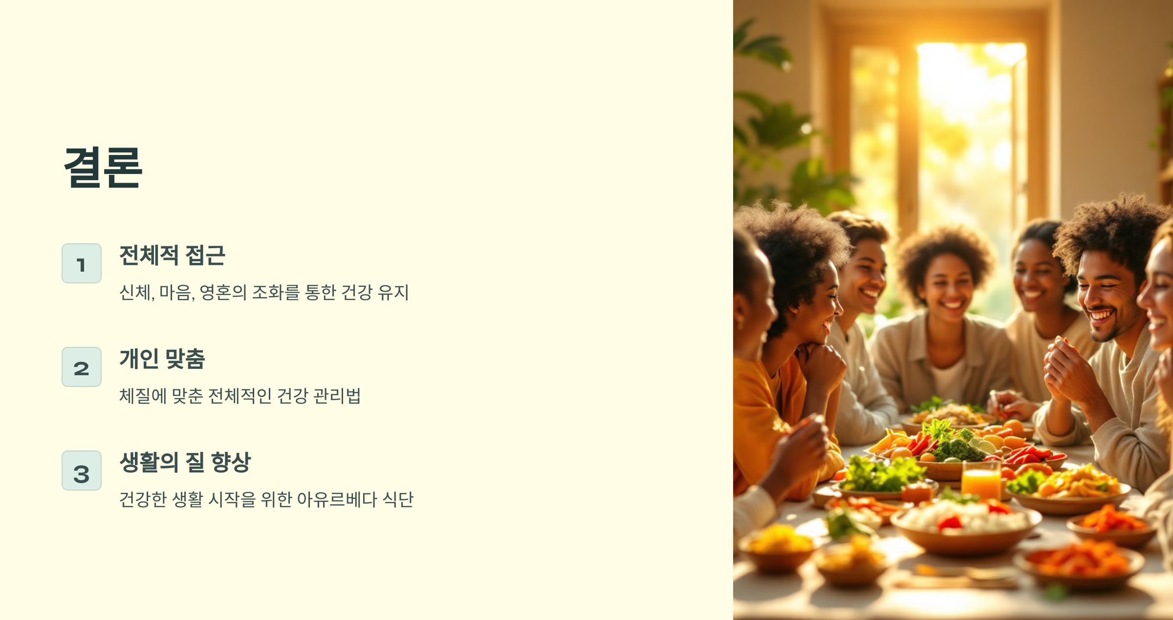 아유르베다 식단은 신체와 마음, 영혼의 조화를 통해 건강을 유지하고 생활의 질을 높이는 데 중점을 둔 식이요법입니다. 단순히 음식을 섭취하는 것을 넘어서, 개인의 체질에 맞춘 전체적인 건강 관리법으로 볼 수 있습니다. 아유르베다 식단을 통해 건강한 생활을 시작해 보세요!