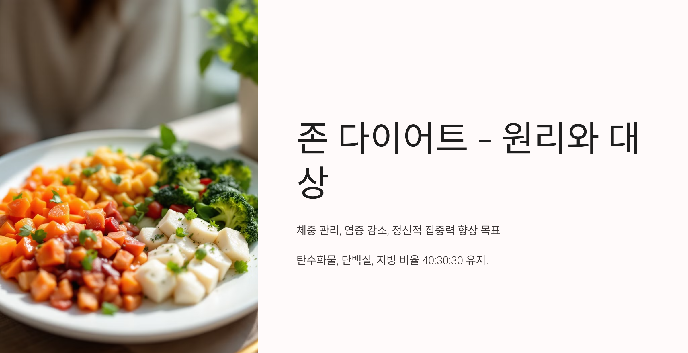 존 다이어트의 핵심은 각 식사에서 탄수화물 40%, 단백질 30%, 지방 30%의 비율을 유지하는 것입니다. 이 비율은 혈당을 안정시키고 인슐린 수치를 조절해, 체내 염증을 줄이는 데 도움을 줍니다. 또한, 인슐린과 글루카곤 호르몬의 균형을 맞춰 체지방을 에너지로 전환할 수 있도록 돕습니다.