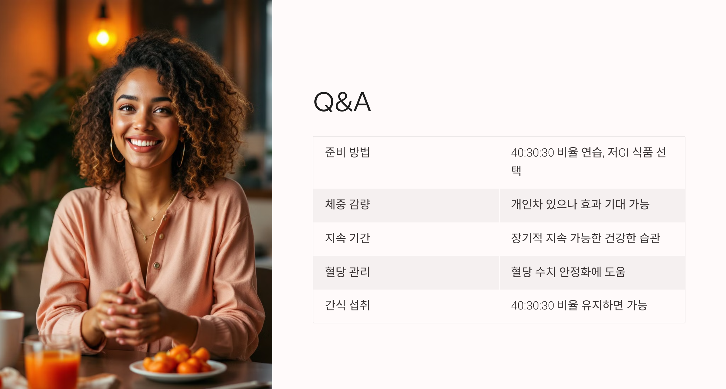 A1: 각 식사에 탄수화물, 단백질, 지방을 40:30:30 비율로 맞추는 연습을 해보세요. GI가 낮은 음식을 중심으로 식단을 구성하는 것도 좋습니다.