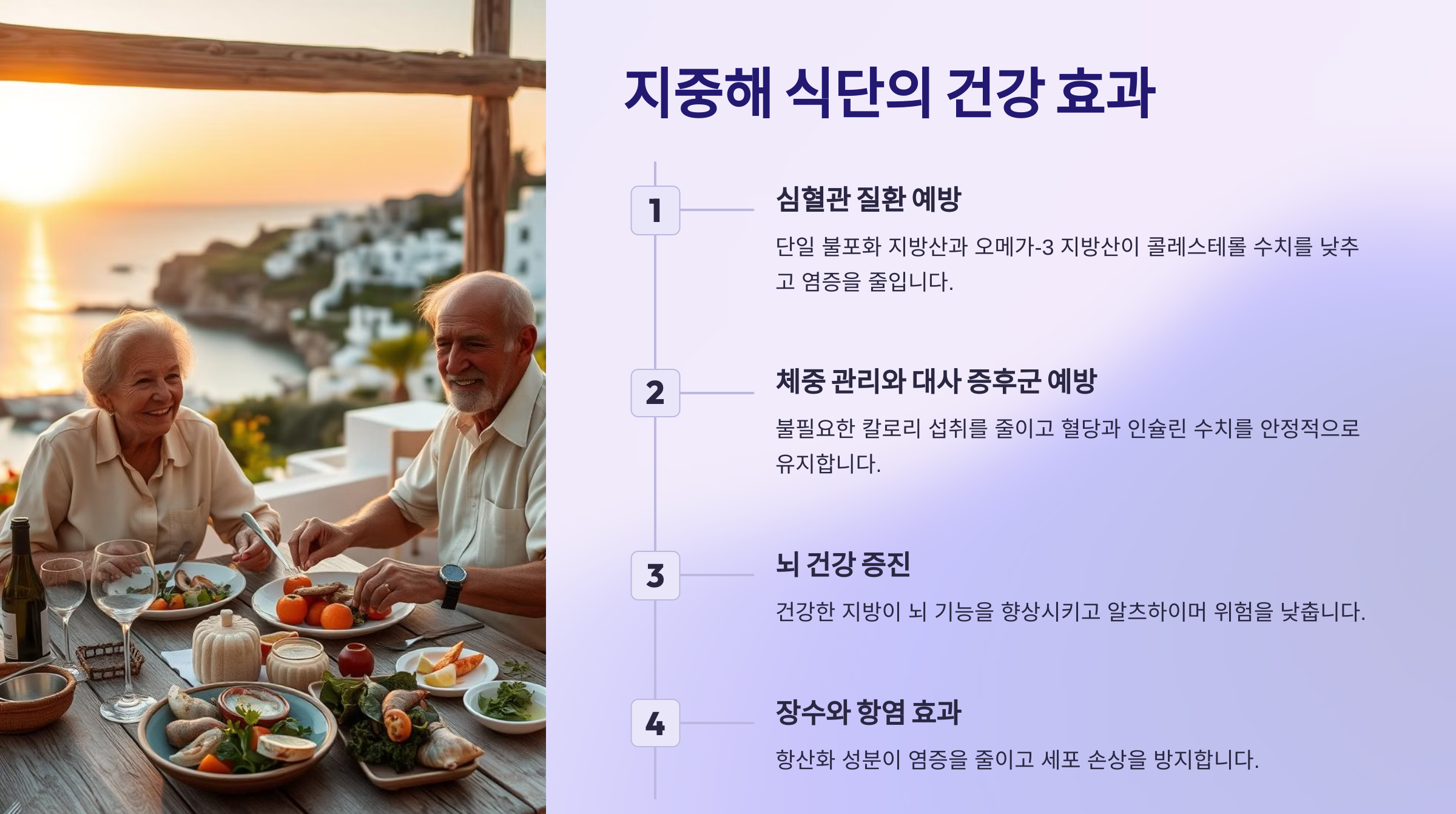 지중해 식단이 세계에서 가장 건강한 식단으로 불리는 이유는 여러 연구를 통해 입증된 다양한 건강 효과 덕분입니다. 이 식단이 건강에 미치는 대표적인 긍정적인 영향을 살펴보겠습니다.
