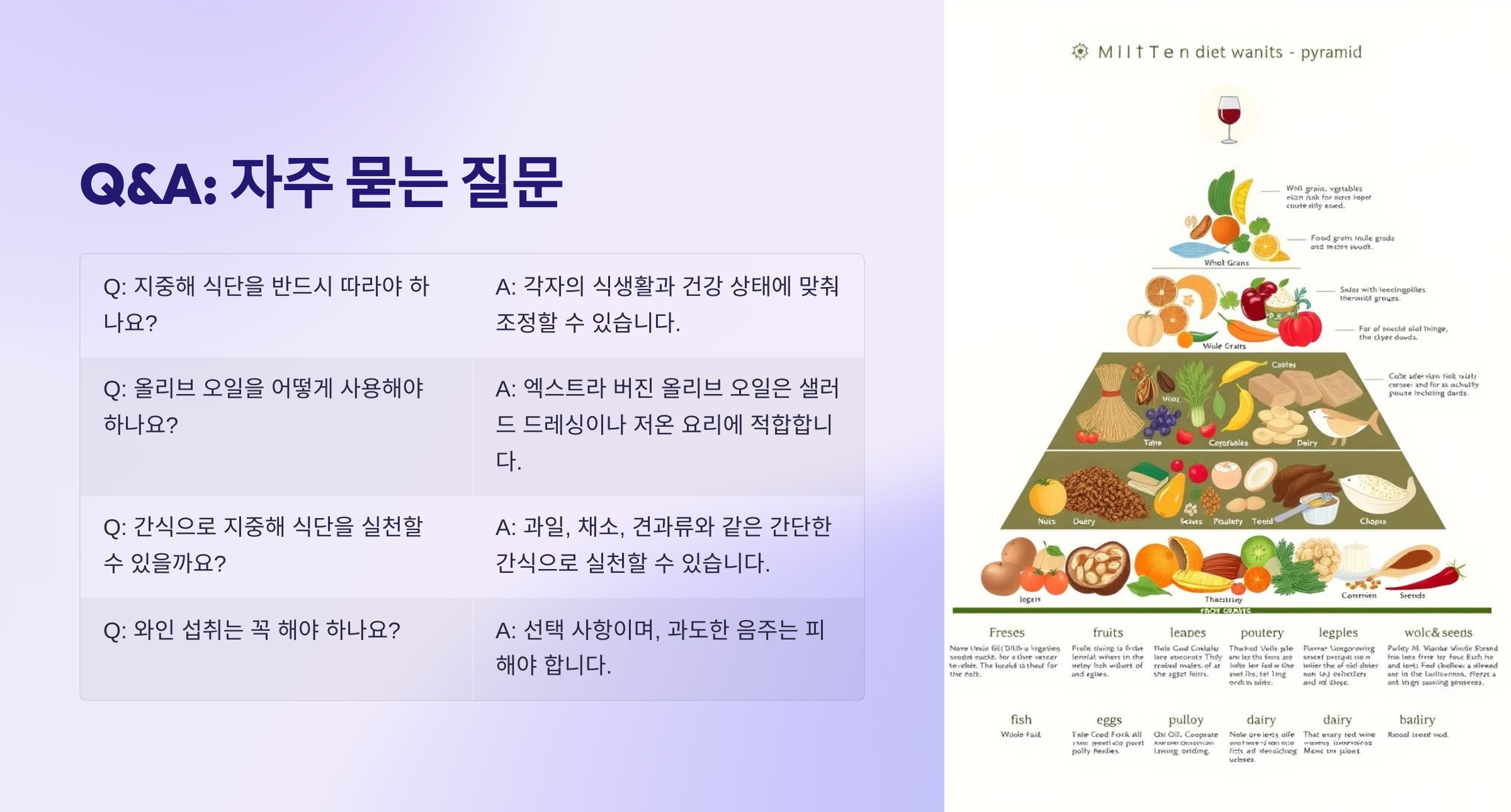 A1: 지중해 식단은 건강한 식단 중 하나이지만, 각자의 식생활과 건강 상태에 맞춰 조정할 수 있습니다. 중요한 것은 신선한 재료와 균형 잡힌 식단을 유지하는 것입니다.