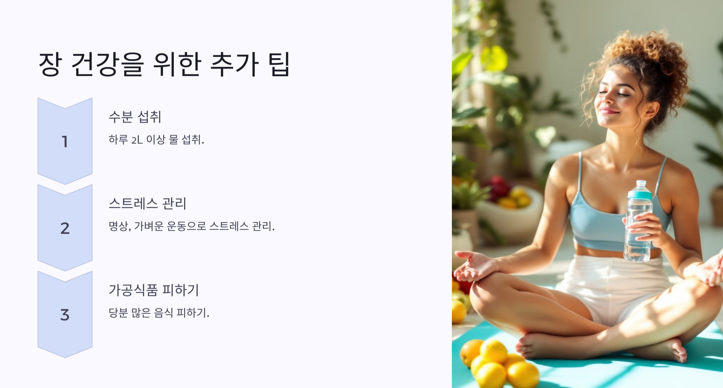 - 스트레스 관리: 스트레스는 장 건강에 부정적인 영향을 미칩니다. 명상이나 가벼운 운동으로 스트레스를 관리해 장내 환경을 유지하세요.