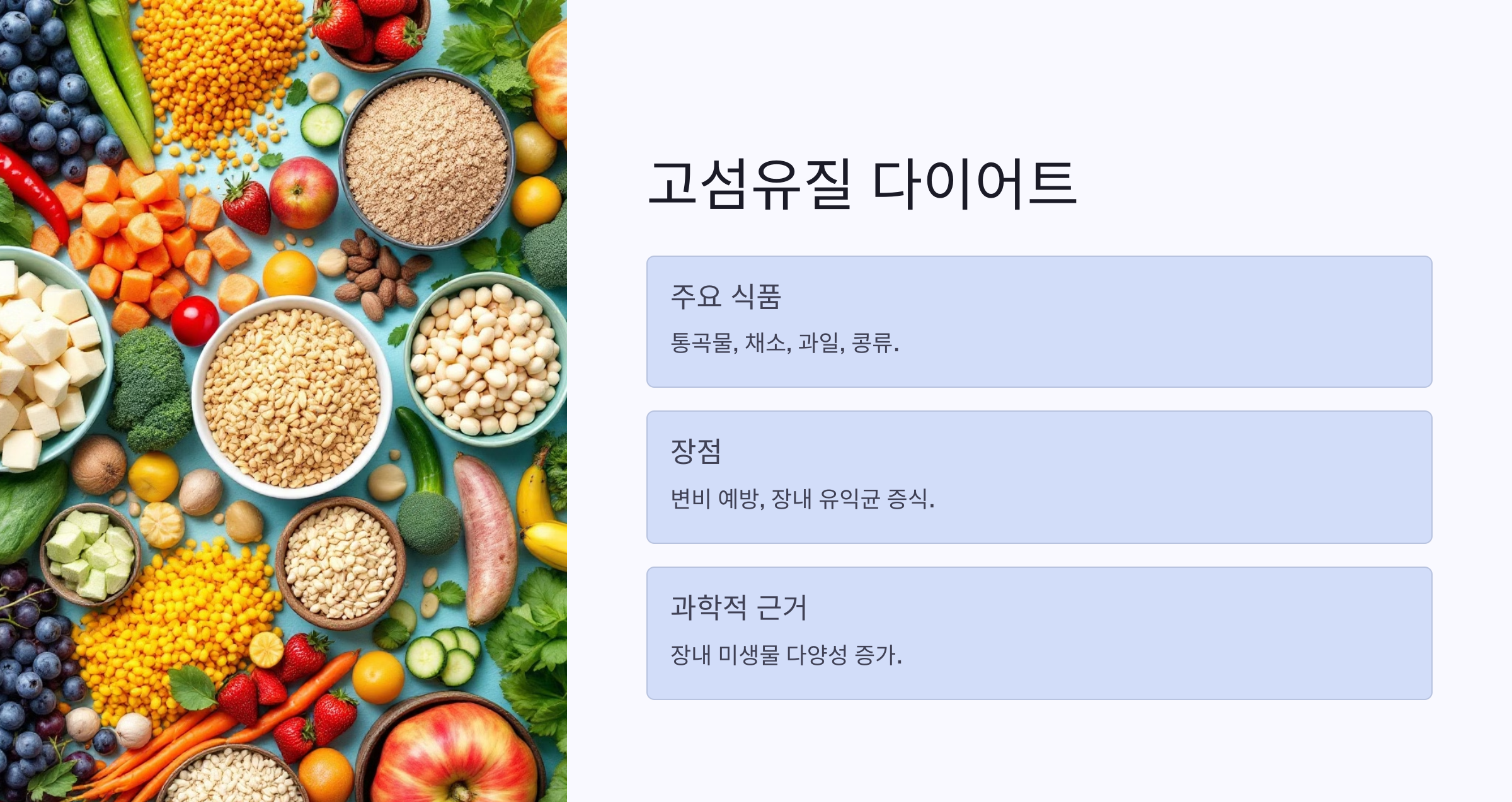 - 과학적 근거: 연구에 따르면, 고섬유질 식단이 장내 미생물의 다양성을 높여 장 건강에 도움을 준다고 합니다.