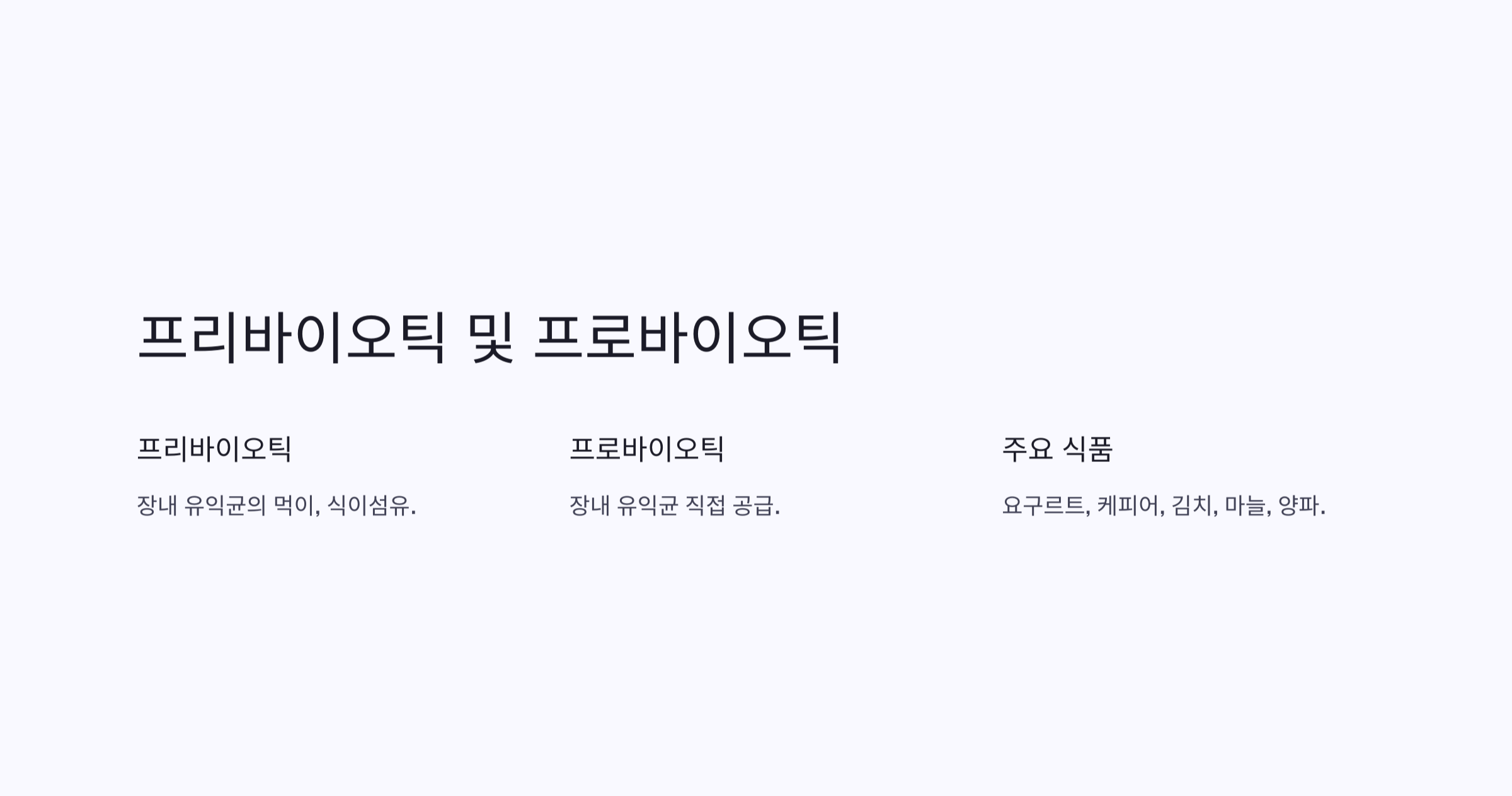 - 장점: 장내 유익균 증식, 소화 기능 향상, 면역력 강화