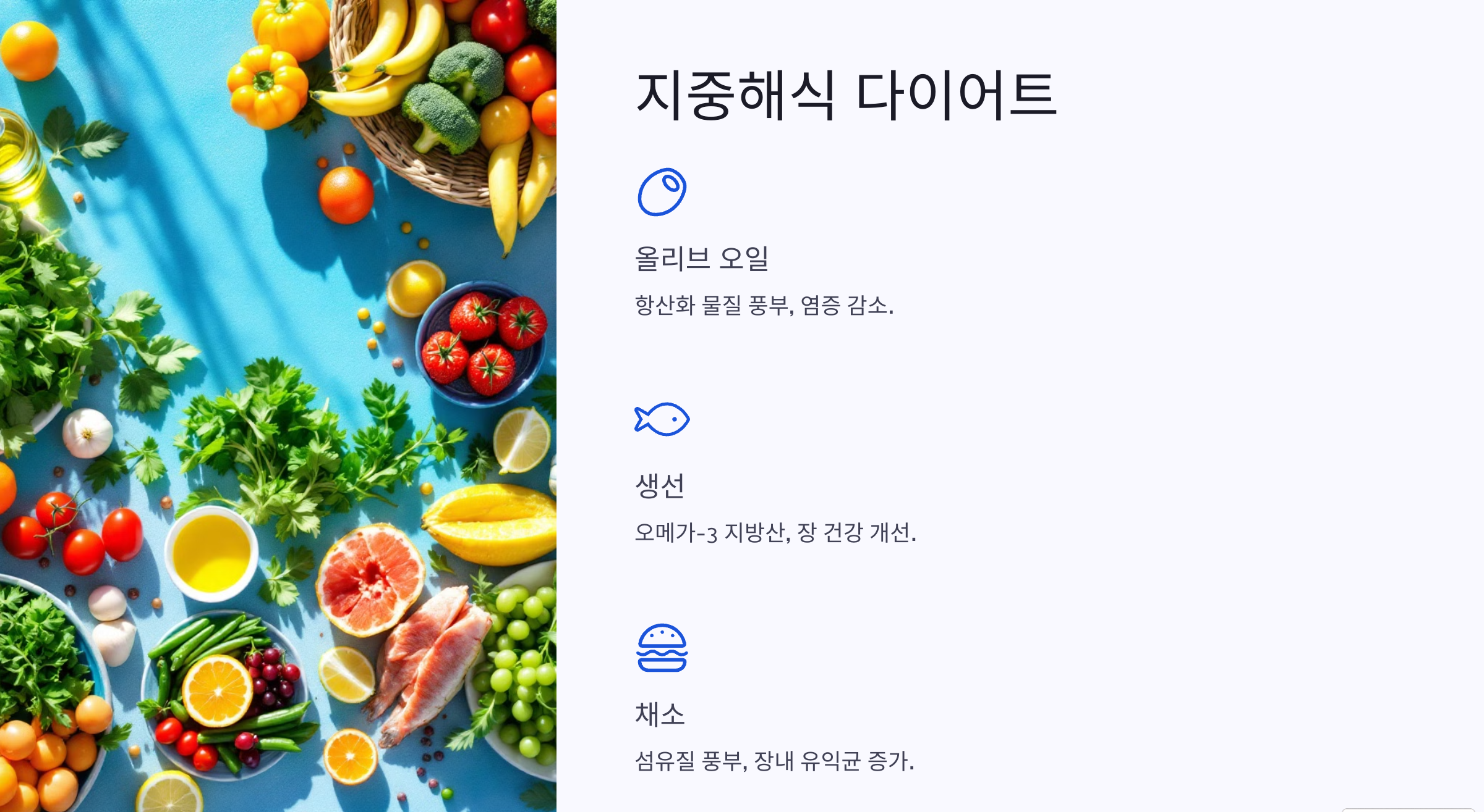 - 주요 특징: 식물성 식품 위주, 올리브 오일과 생선 섭취 권장