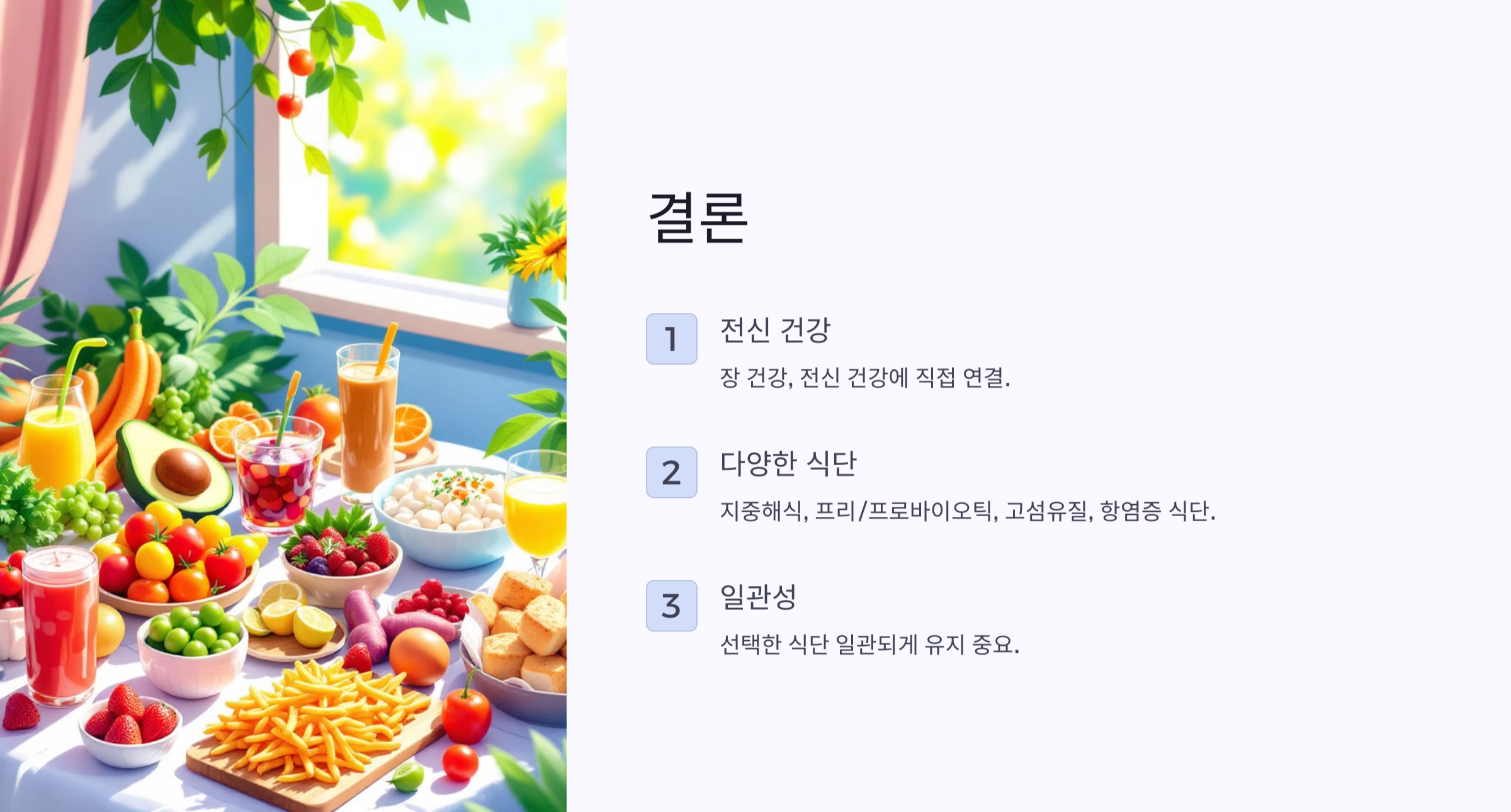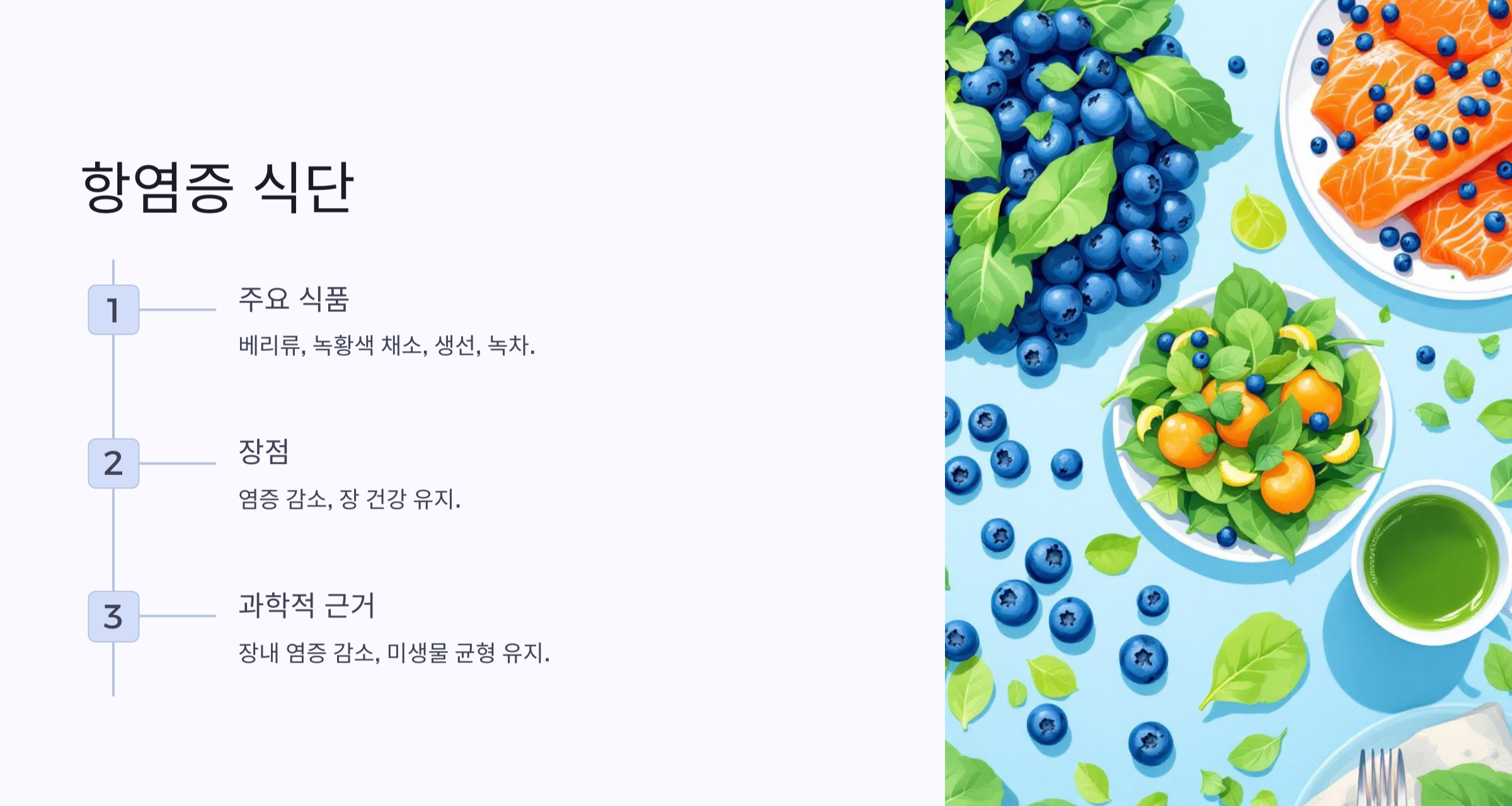 - 과학적 근거: 항염증 식단은 장내 염증을 줄여 장내 미생물의 건강한 균형을 유지하는 데 효과적입니다.