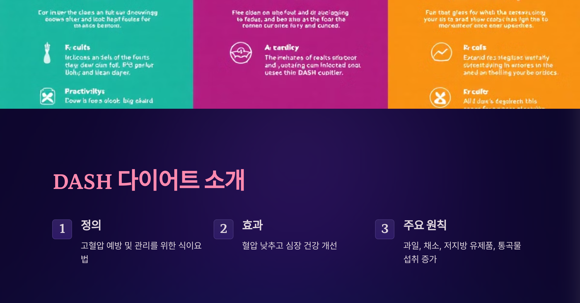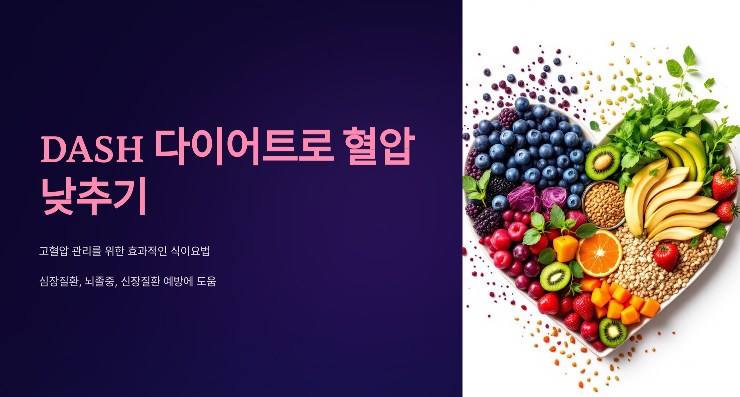 DASH 다이어트(Dietary Approaches to Stop Hypertension)는 고혈압을 예방하고 관리하기 위해 만들어진 식이 요법입니다. 미국 국립보건원(NIH)에서 연구한 결과, DASH 식단은 혈압을 낮추고 심장 건강을 개선하는 데 효과적임이 입증되었습니다. DASH 다이어트는 다음과 같은 원칙을 기반으로 합니다: